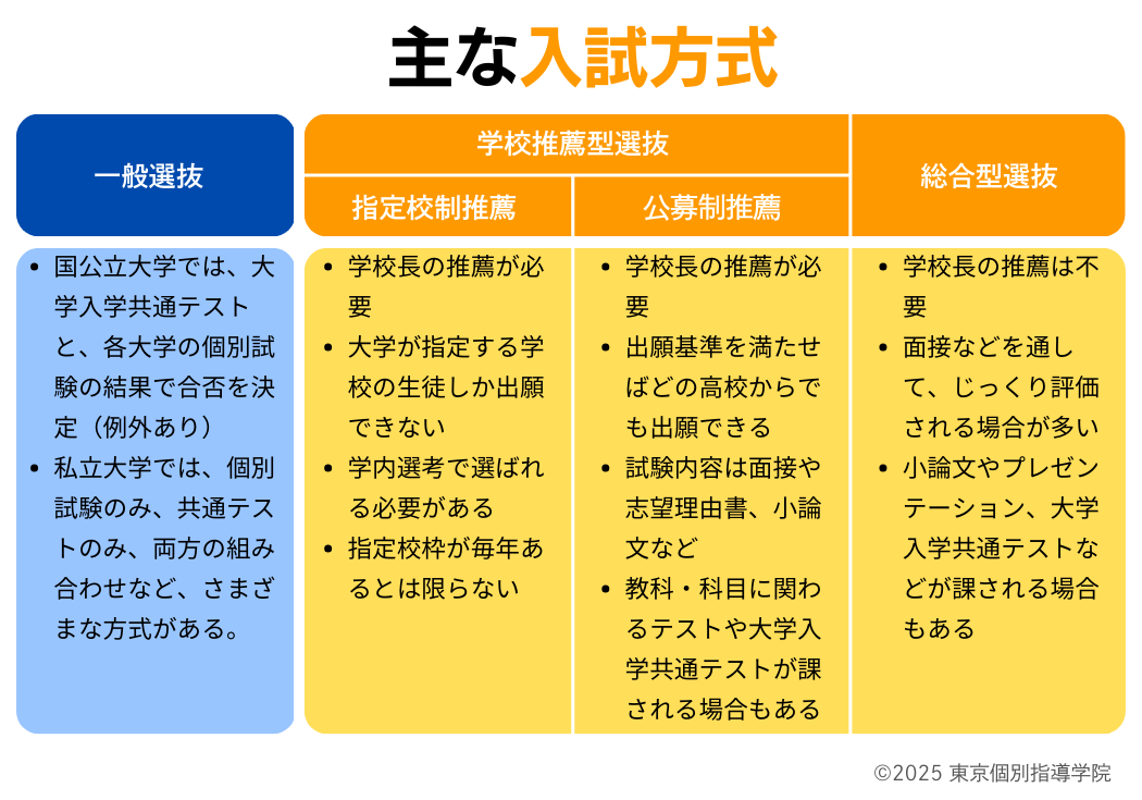 ただし、ひとくちに「一般選抜」「総合型選抜」などと言っても、大学によってその方式や選抜内容はさまざまです。