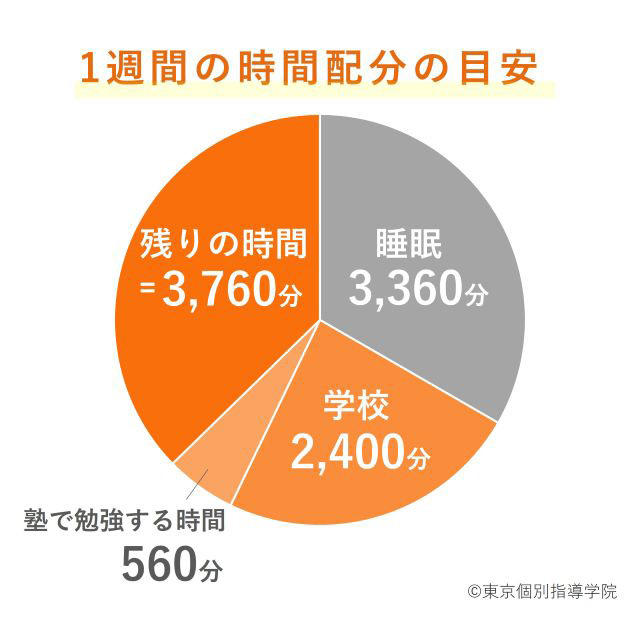 さらに、下の図のように、1日の睡眠時間を8時間(3,360分/週)、学校で過ごす時間を1日8時間(2,400分/週)とした場合、1週間で残る時間は約62時間40分(3,760分)です。