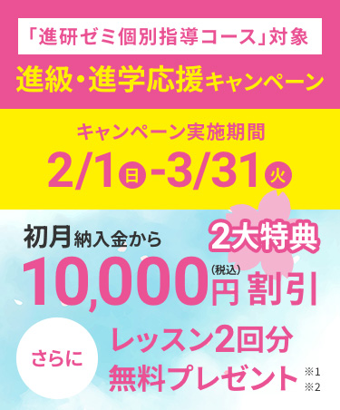 - (※1)2/1~3/31に「進研ゼミ個別指導コース」をご契約いただき、かつ初回レッスン開始日が2/1~4/30の方は、「進級・進学応援キャンペーン (初回納入金から10,000円割引と2コマ無料プレゼント)」の対象となります。※無料プレゼントの2コマは、受講開始月の翌月末までにご利用くださ い。※他のキャンペーンとの併用はできません。詳細は、ご契約・ご入会時に教室にてご確認ください。※レッスンは1回80分です。ただし、4/1以降に大阪府、兵庫県所在の教室で受講いただく場合、レッスンは1回70分になります。京都府所在の教室でご受講いただく場合は、すべて1回70分になります。